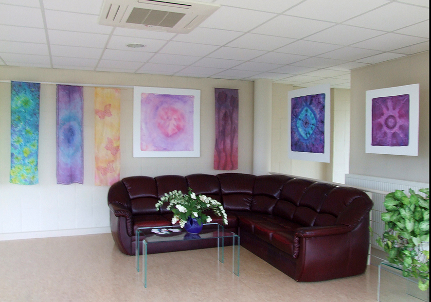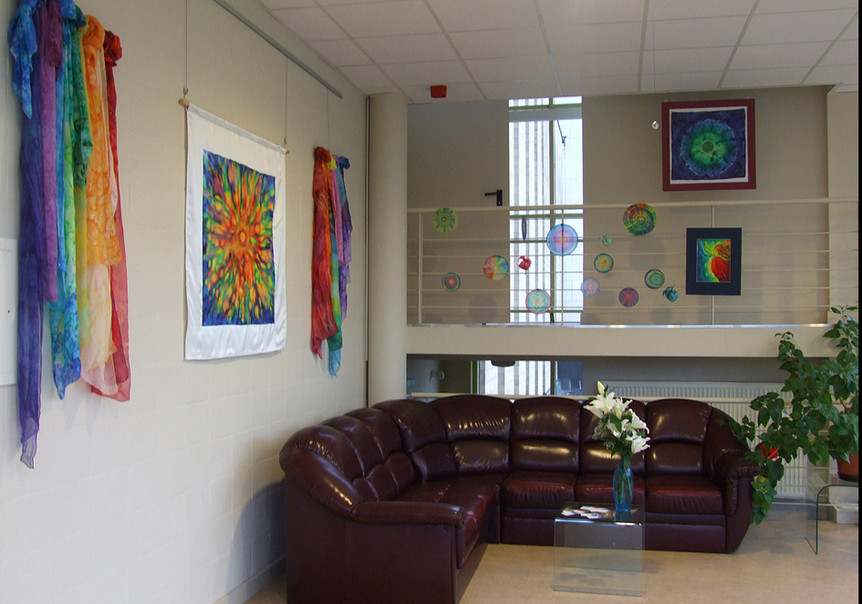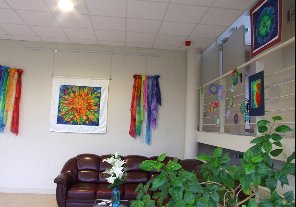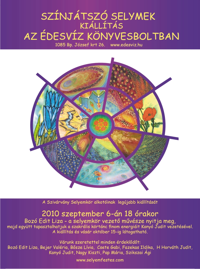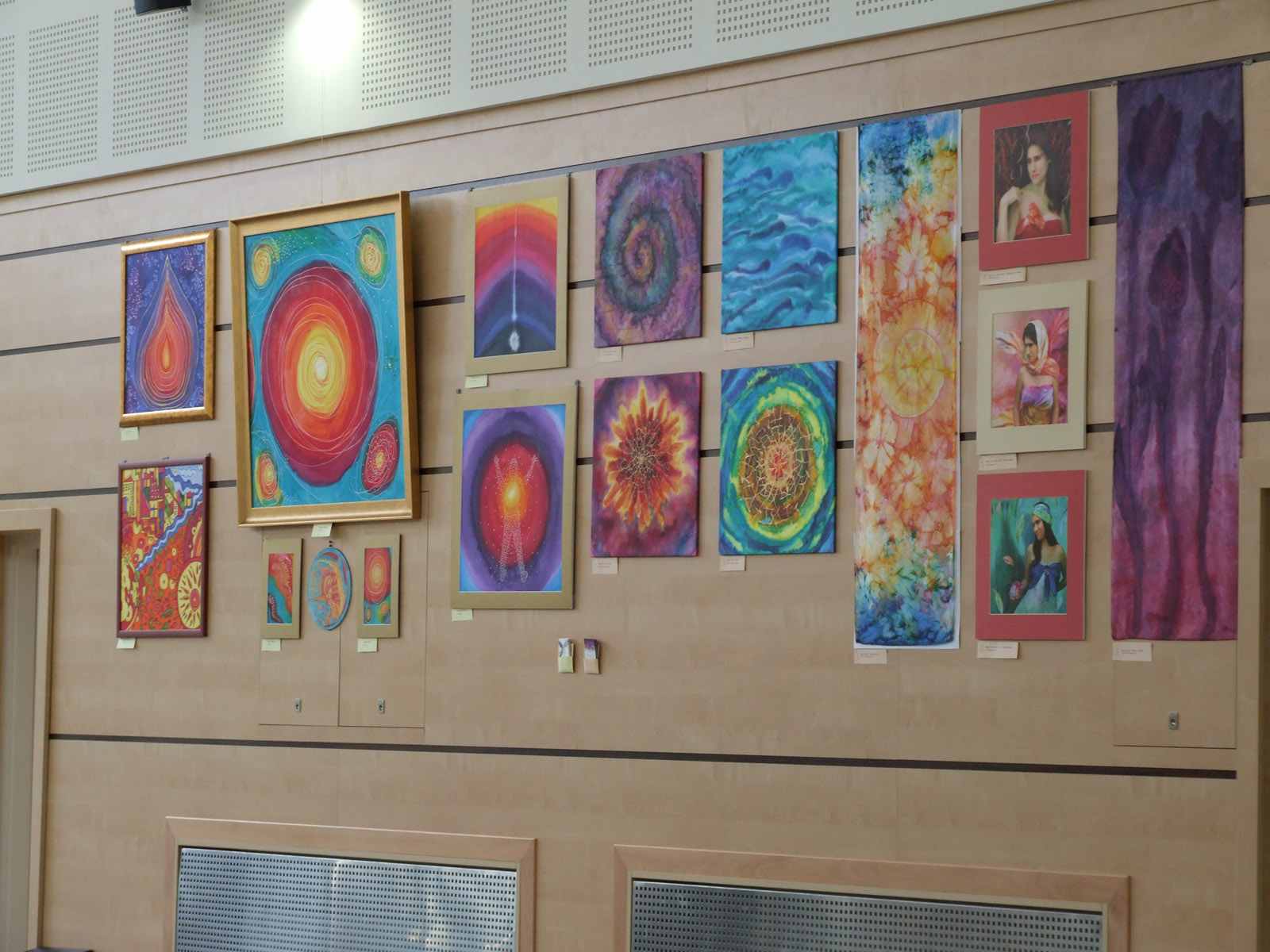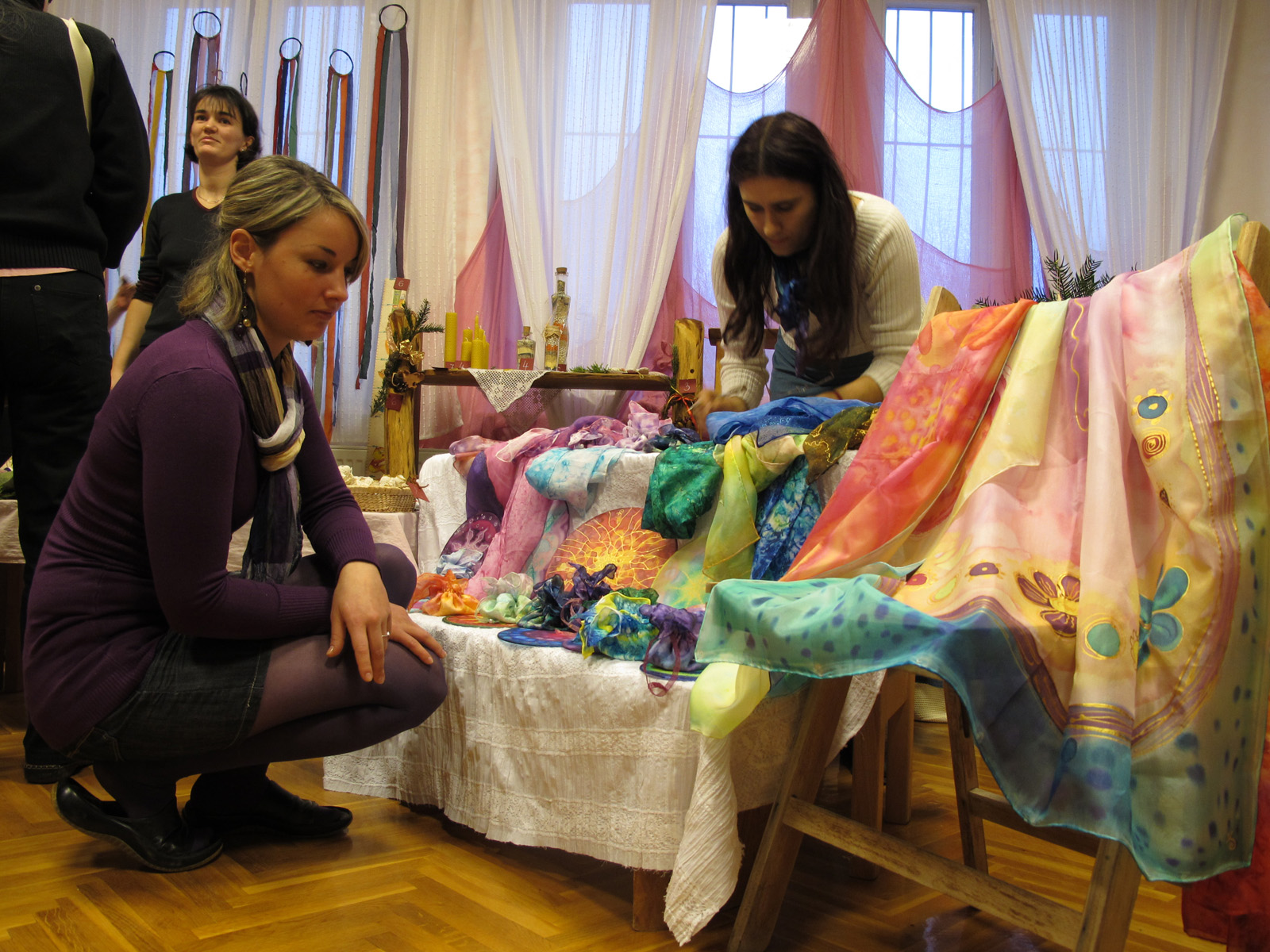 A terem a Szivárvány selyemfestő kör alkotóinak színpompás selymeibe lesz öltöztetve. Képek, mandalák és stólák harmonikus energiája kényezteti a látogatókat.